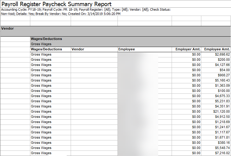 Detail: Vendor, employee name, and employer & employee amounts for gross wages, direct deposits, and all deductions.