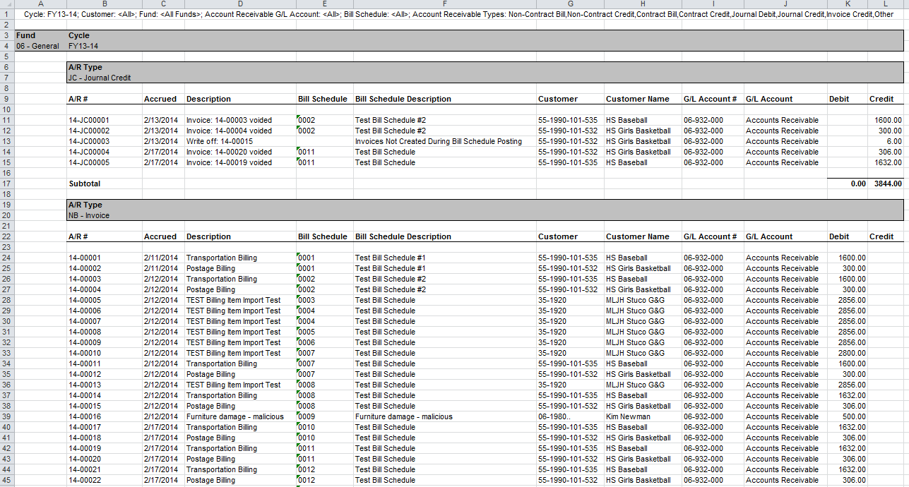 Fields included on the report: AR reference number & description, accrued date, bill schedule name & description, customer ID & name, GL account code & description, debit & credit amounts